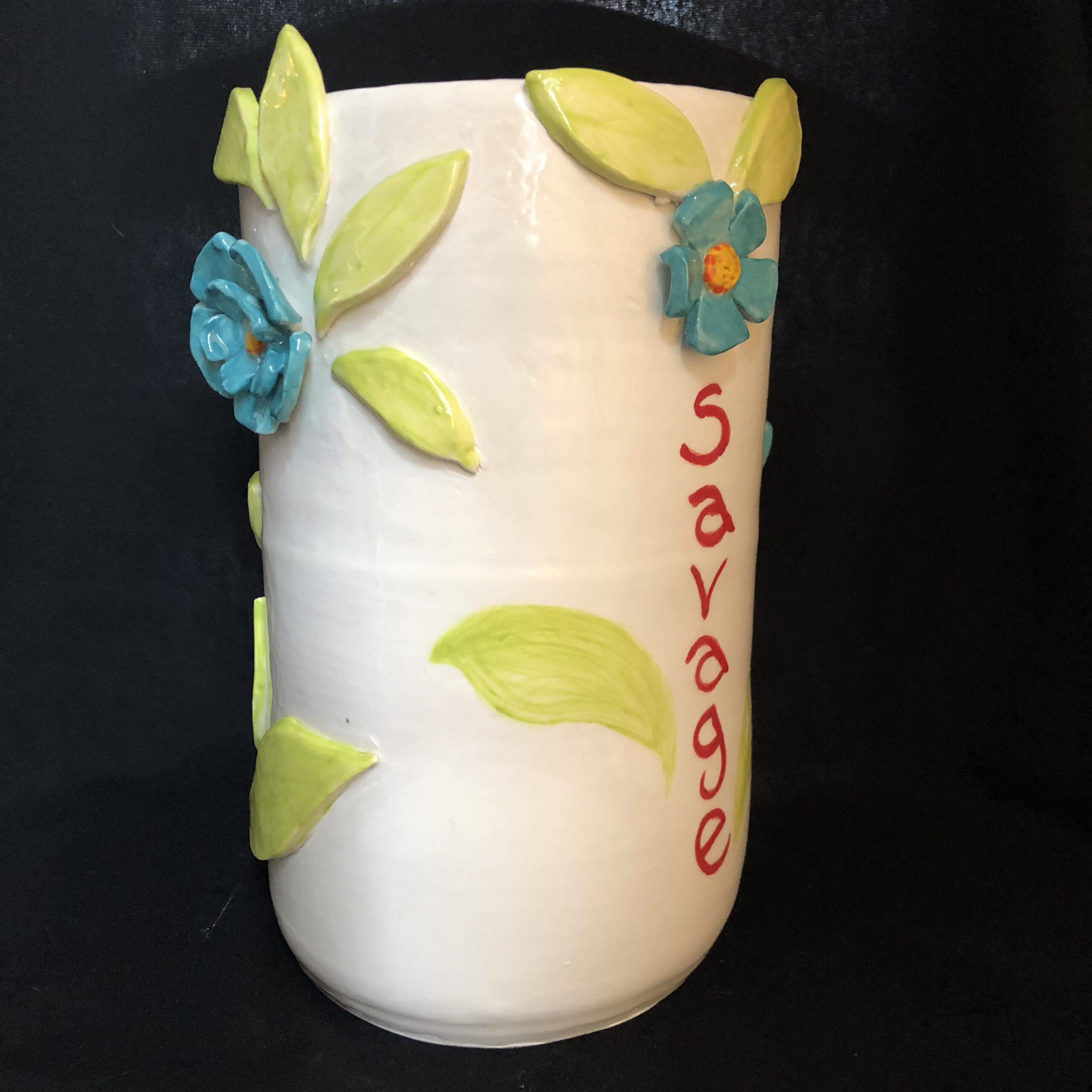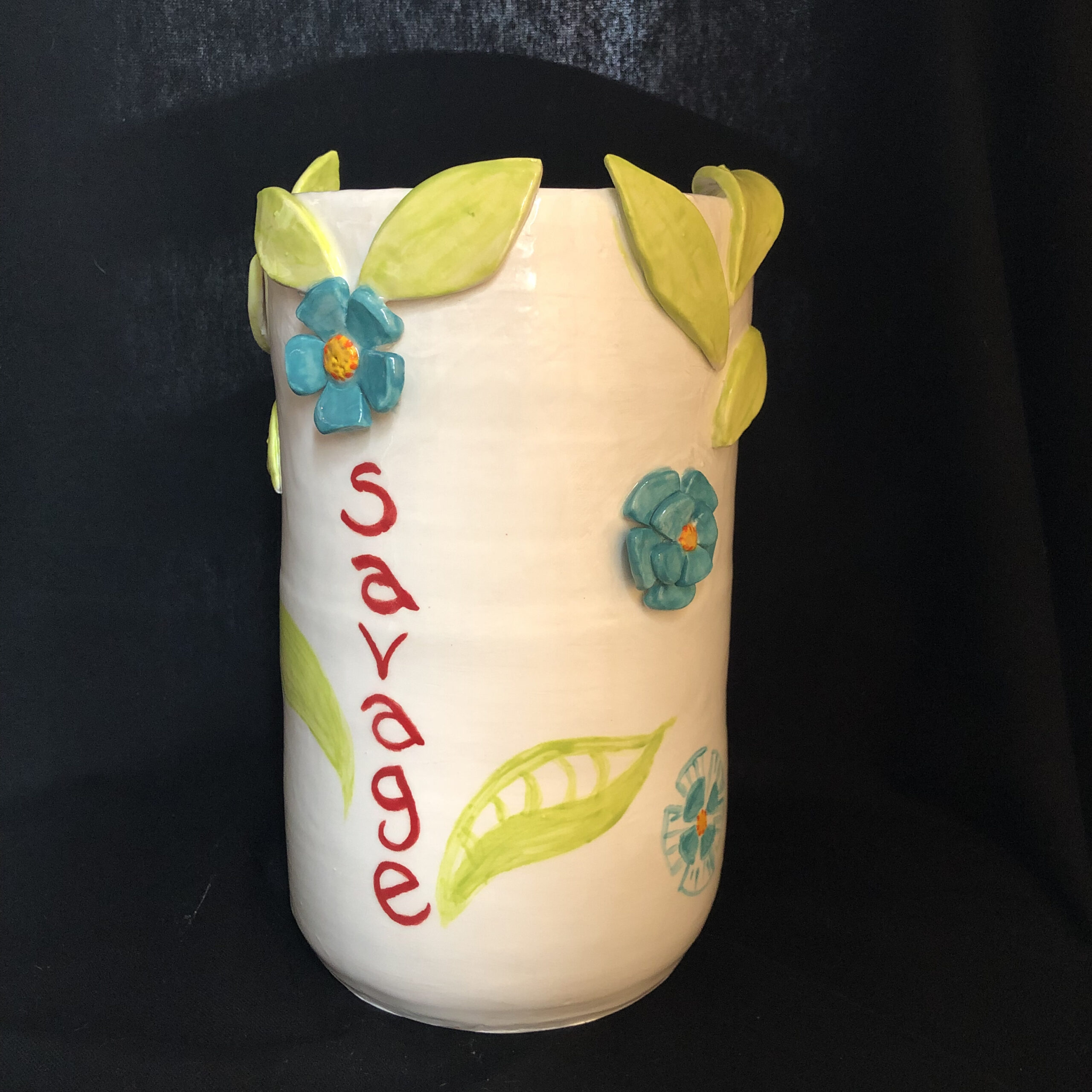 Color-drenched, large vase with hand-sculpted and hand-painted, dimensional floral and leaf elements complimented with hand painted design. Colors: turquoise, Chartreuse, red, orange, black on bright white ground.