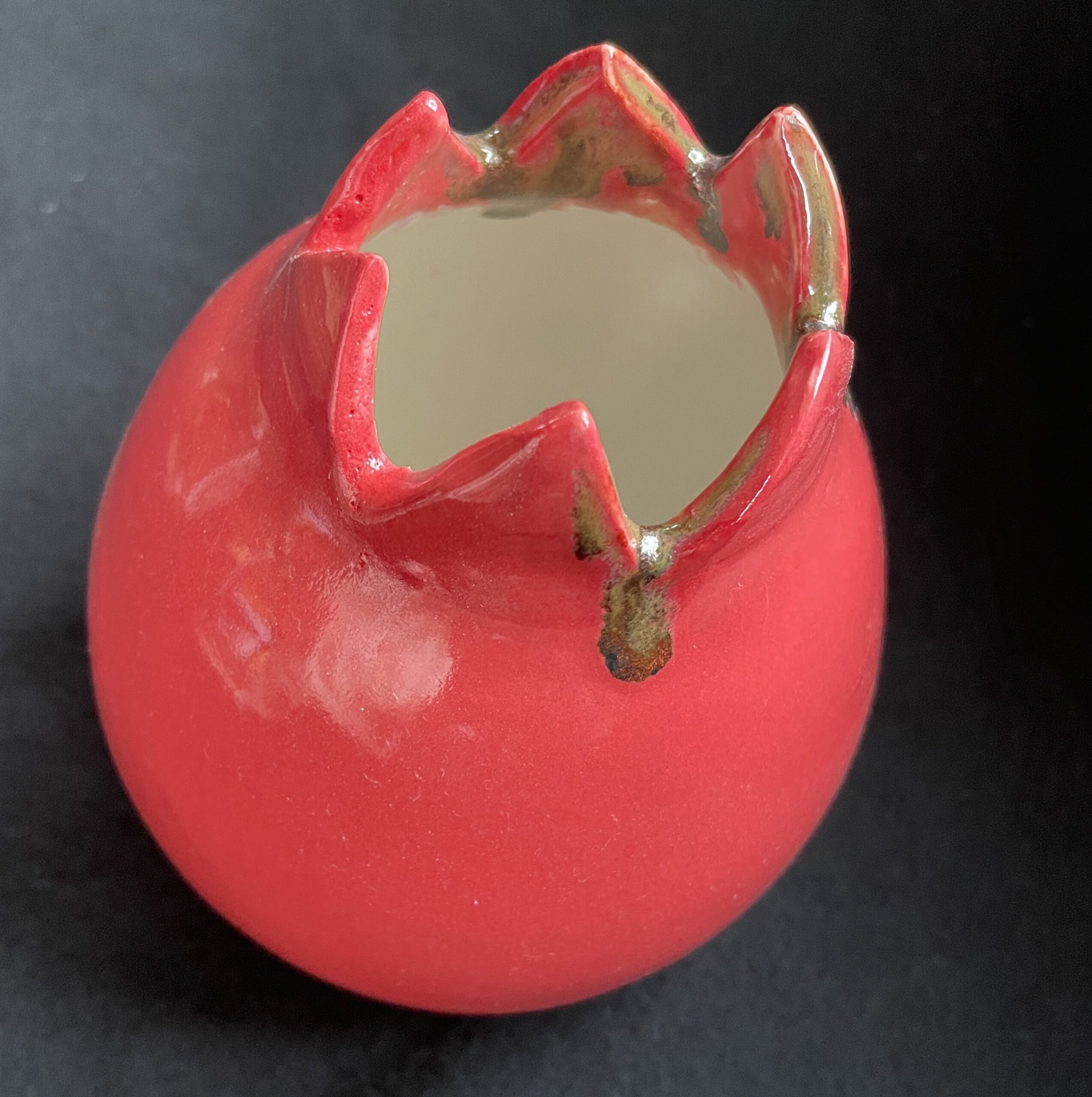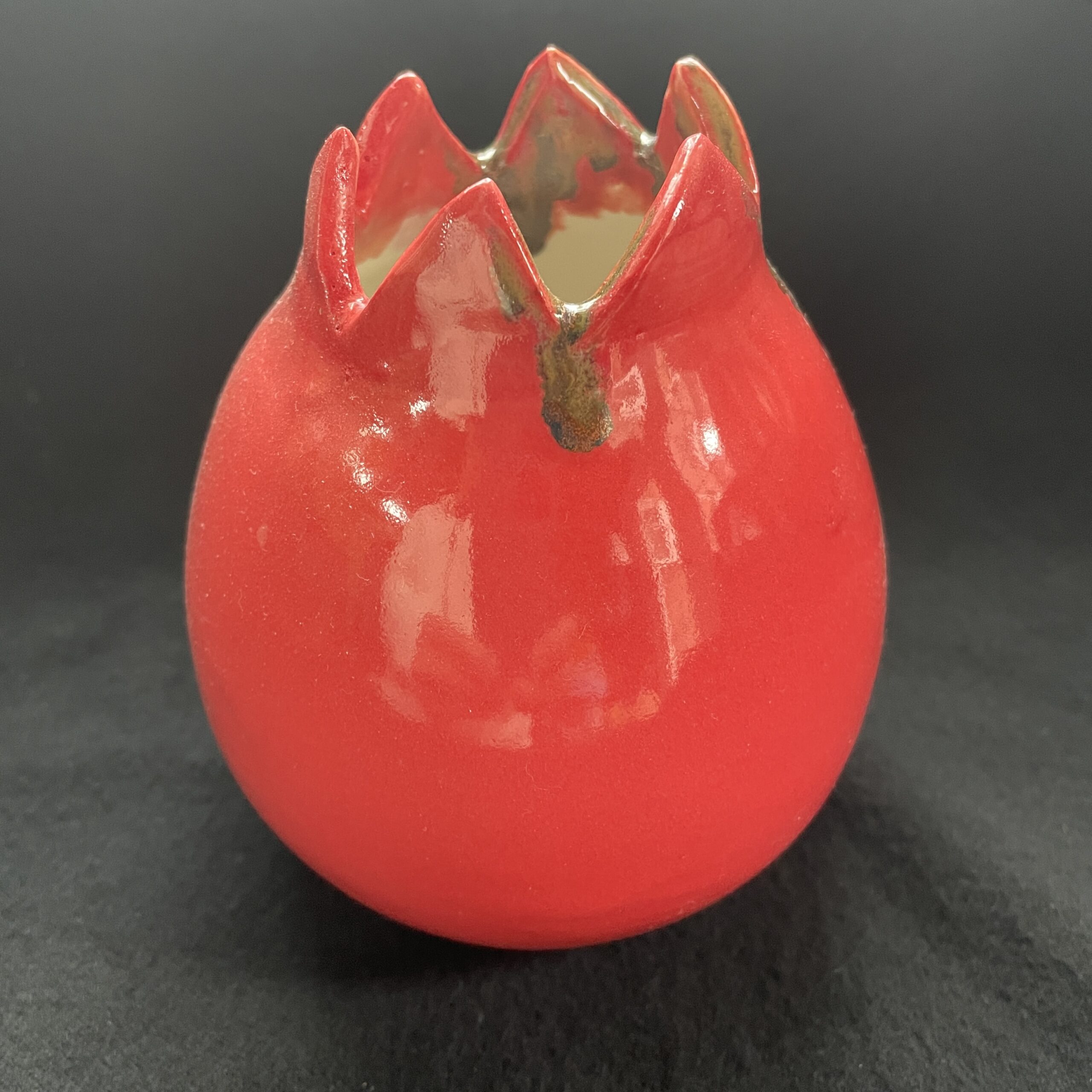 Wheel thrown in porcelain, then shaped into the stylized pomegranite form, The Baroness von Savage Persephone Vase is a fan favorite at every market we do. Ranging in height from 4″ to 5.5″, these striking forms are glazed in a deep red with copper accents at around the neck. We use ours for wildflowers, feathers and placecards. For multiples, please contact us for inventory and delivery time.